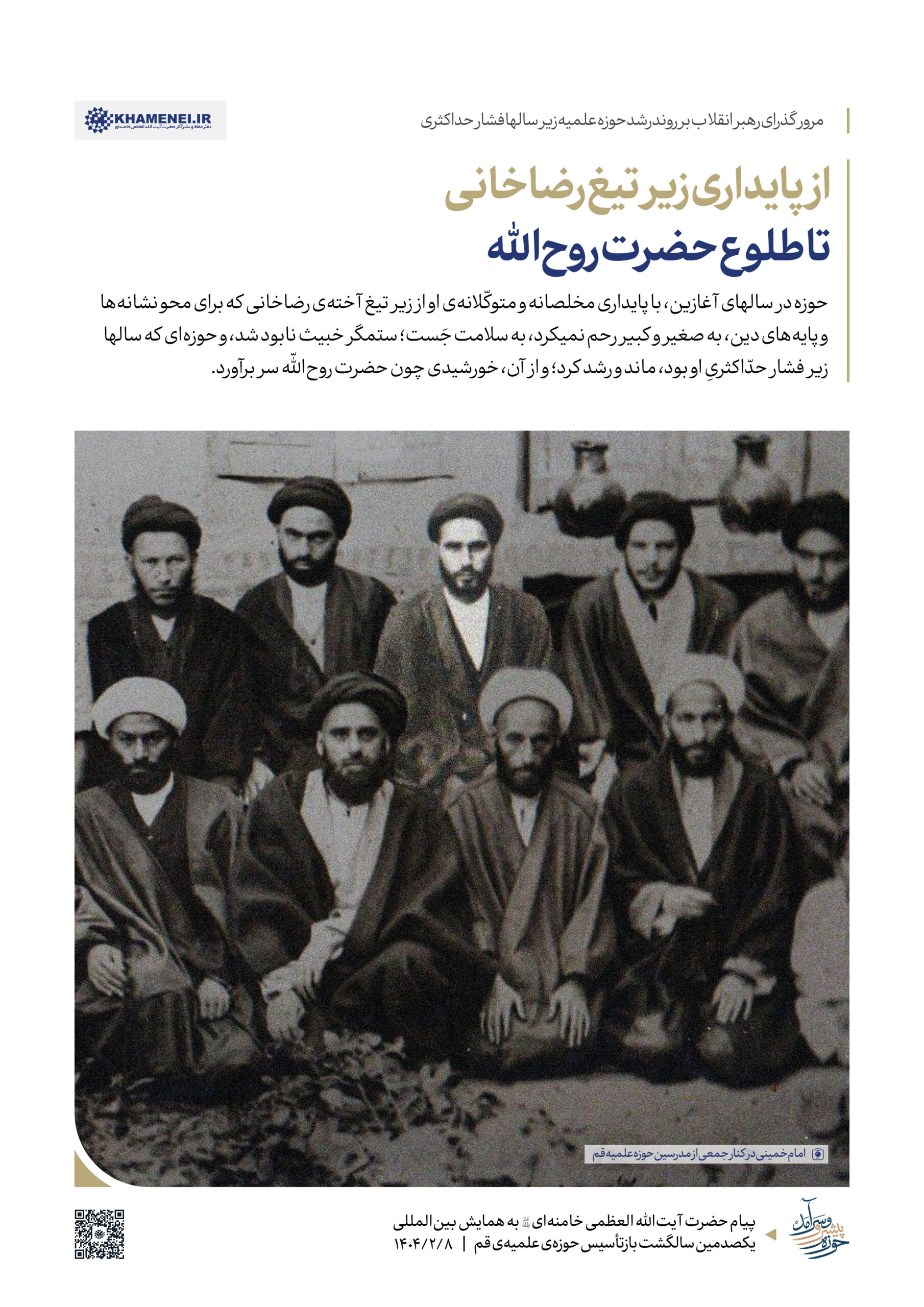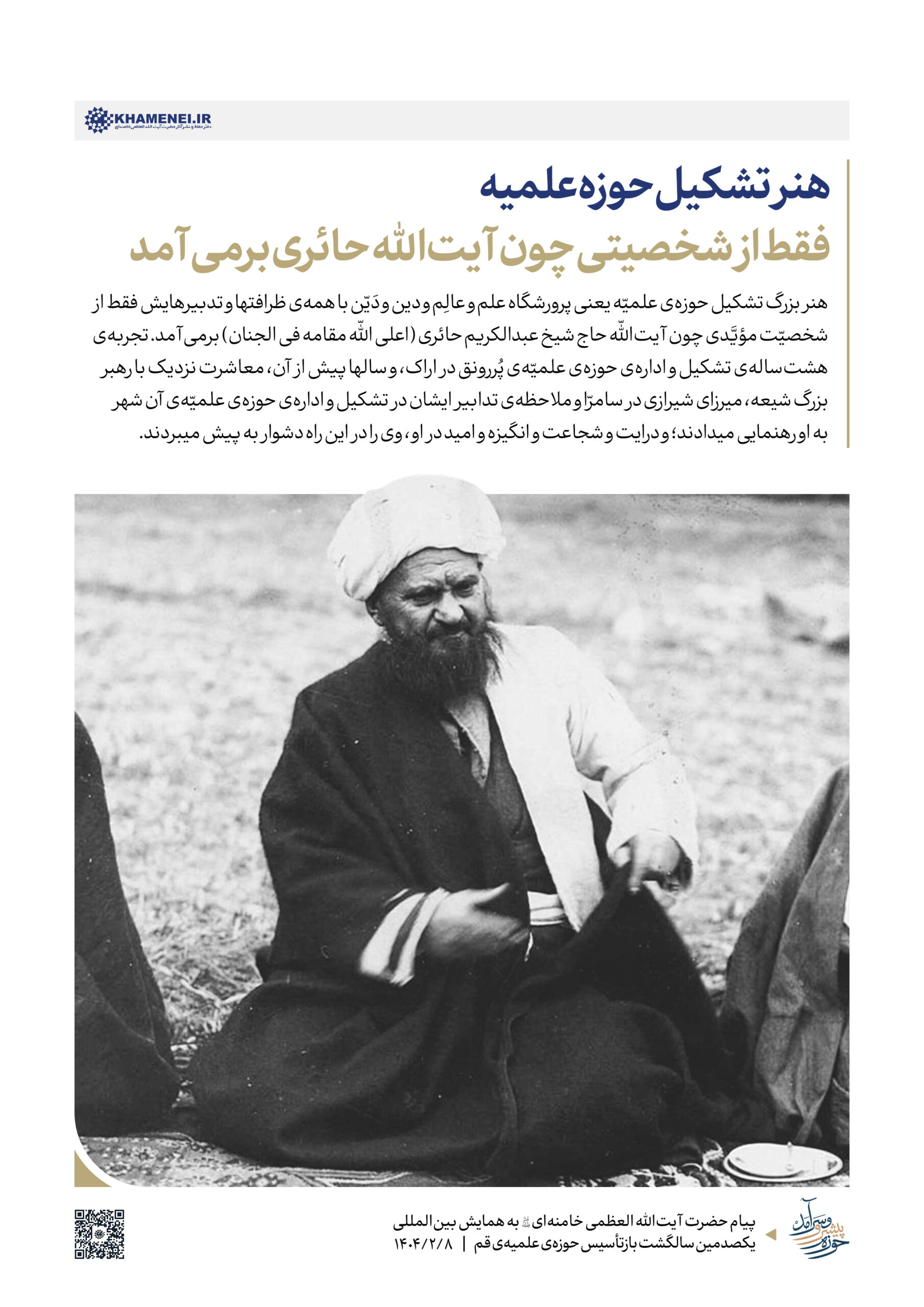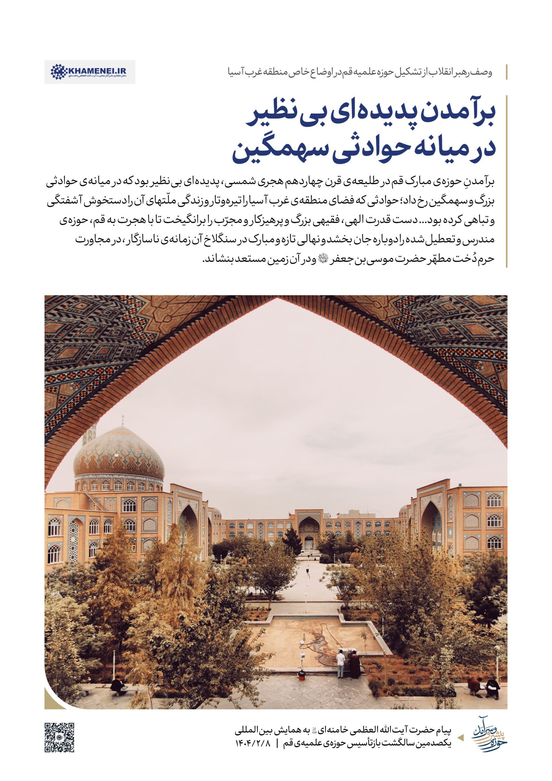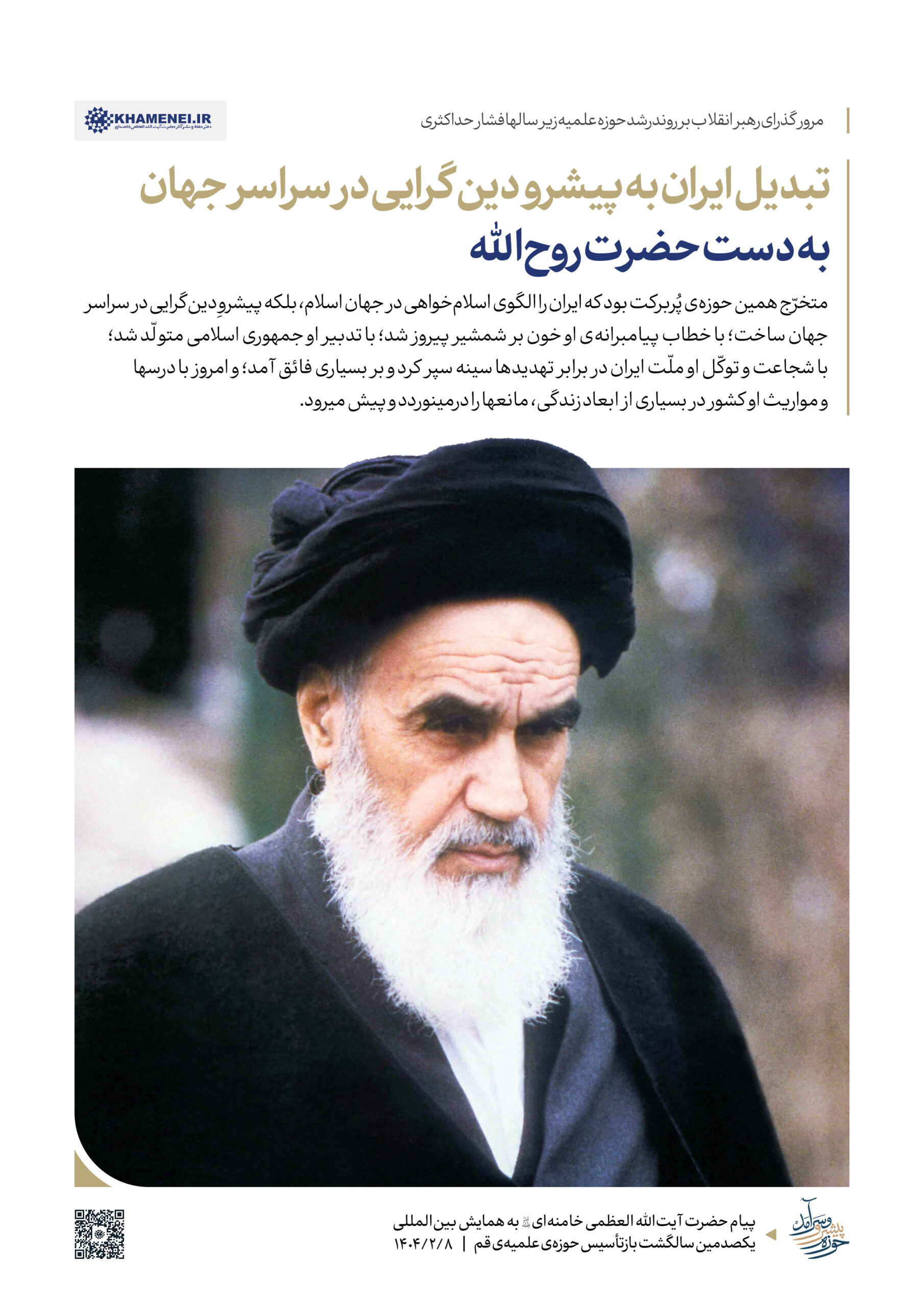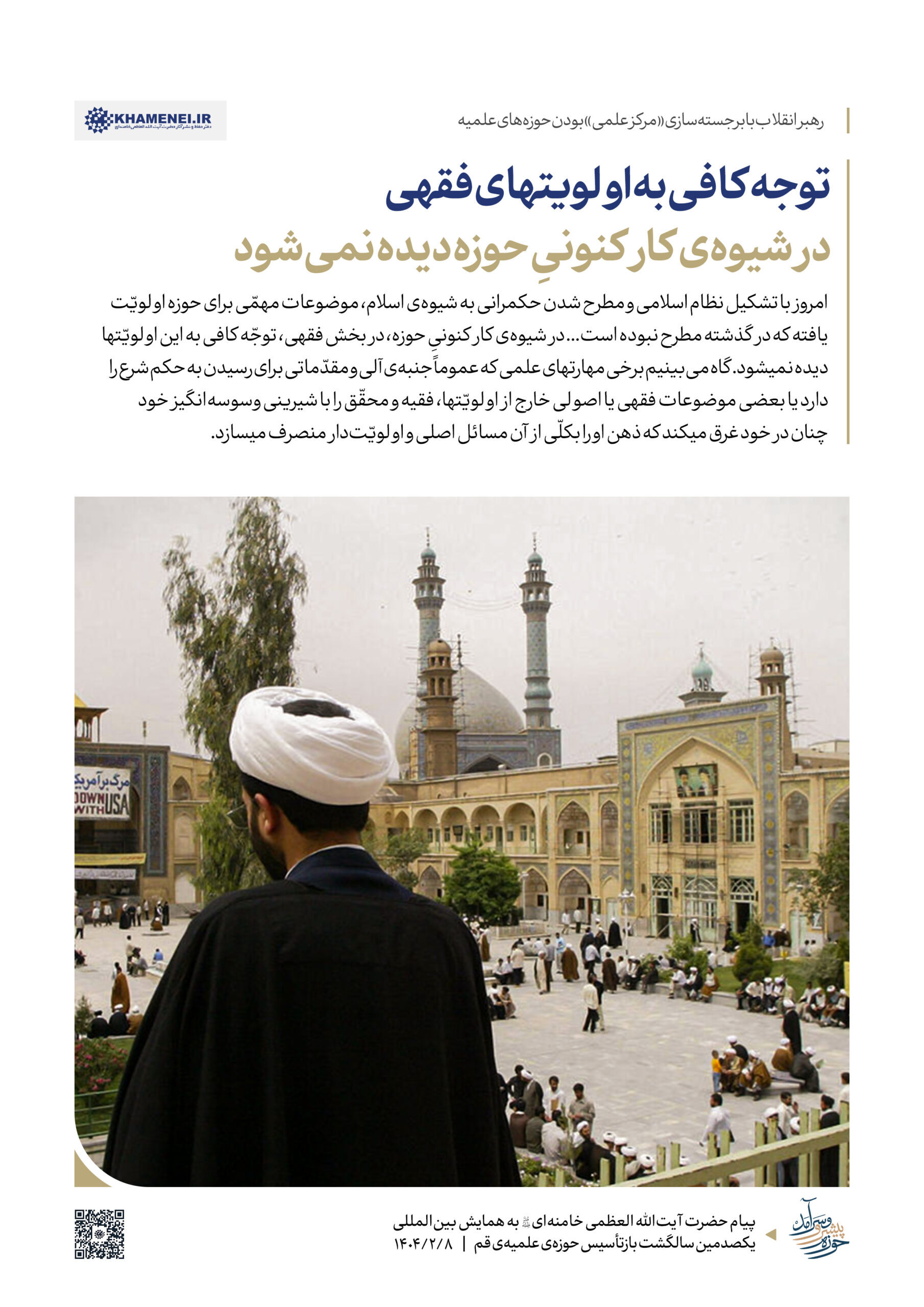 حضرت آیتالله خامنهای رهبر انقلاب اسلامی در پیامی به همایش «یکصدمین سالگشت بازتأسیس حوزه علمیه قم»، ضمن تبیین عناصر و کارکِردهای گوناگون حوزه به بیان الزامات تحقق یک «حوزه پیشرو و سرآمد» که نوآور، بالنده، بهروز، پاسخگوی مسائل نوپدید، مهذّب، دارای روحیه پیشرفت و مجاهدت و هویت انقلابی و همچنین مستعد برای طراحی نظامات اداره جامعه است، پرداختند. به همین مناسبت رسانه KHAMENEI.IR در این اطلاعنگاشت، مروری بر محورهای اصلی و توصیههای رهبر انقلاب در این پیام داشته است.