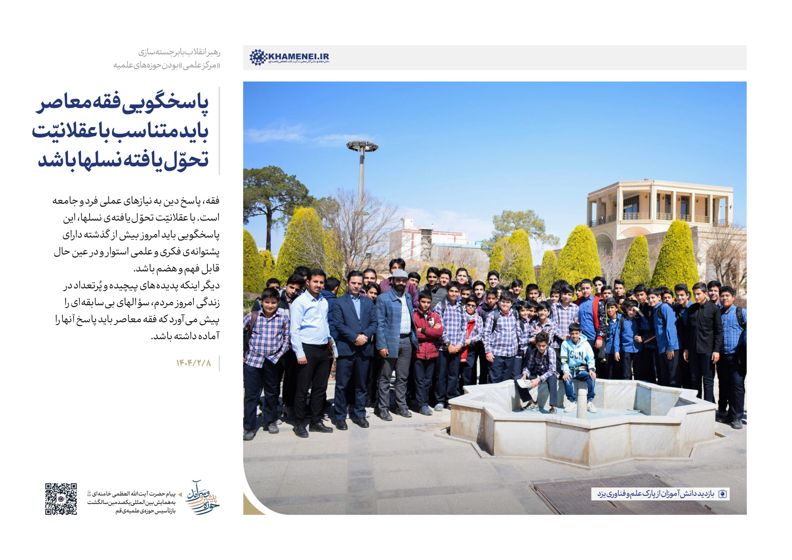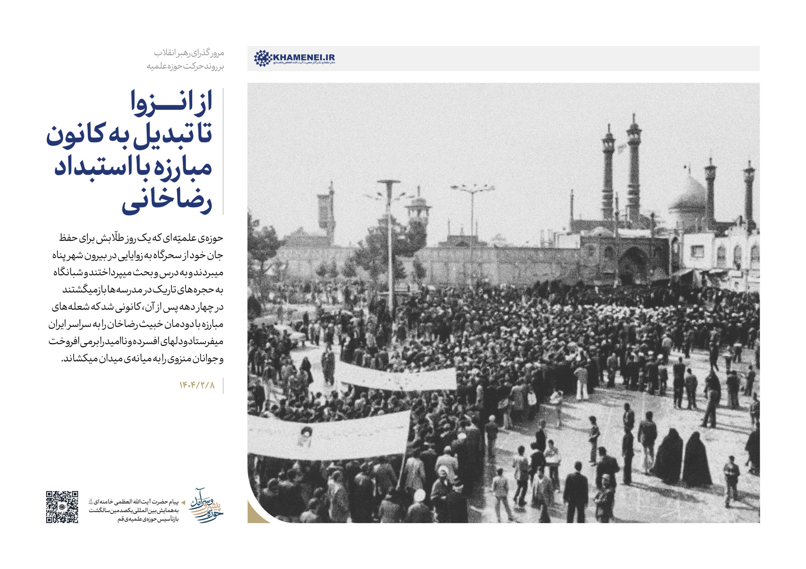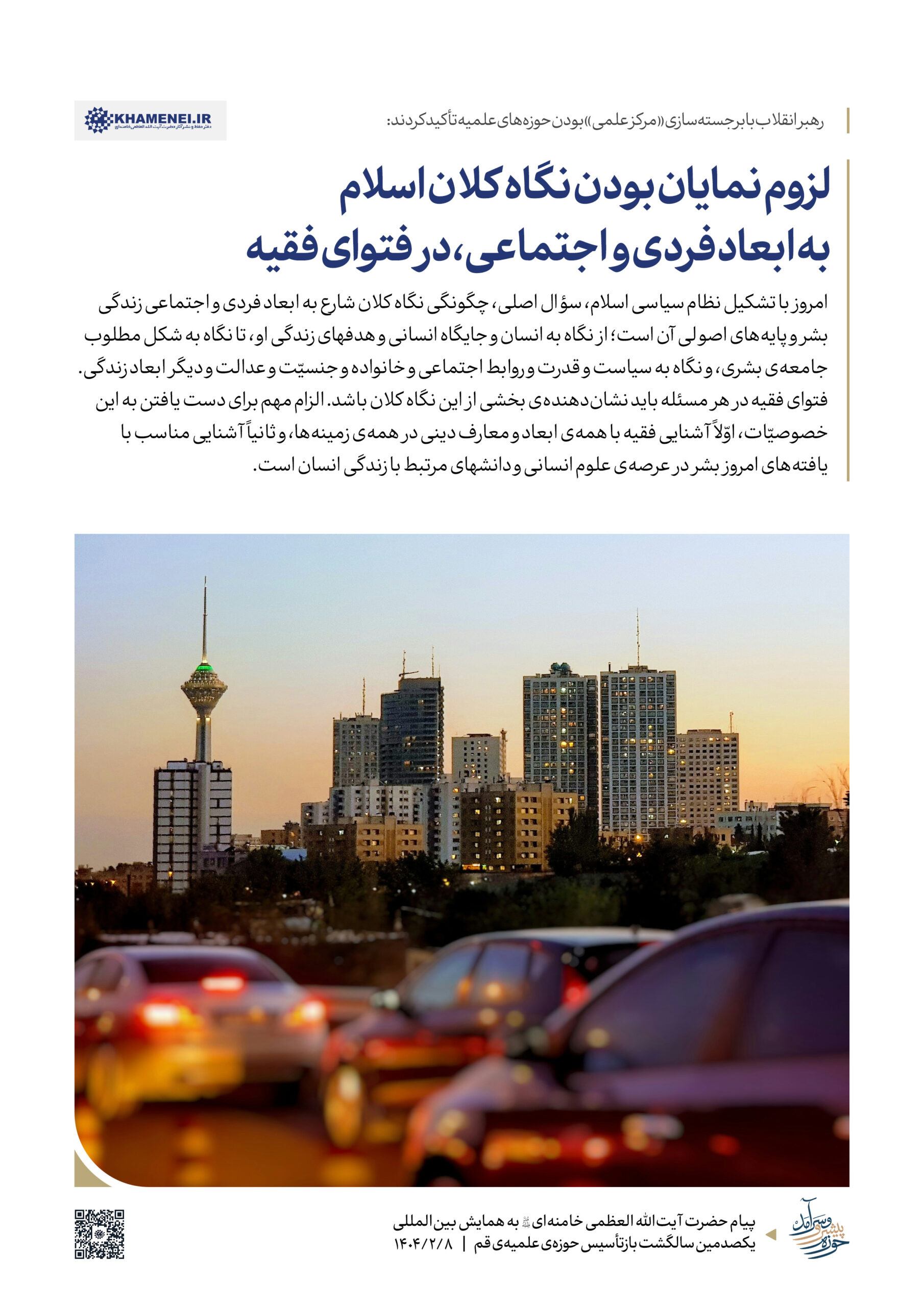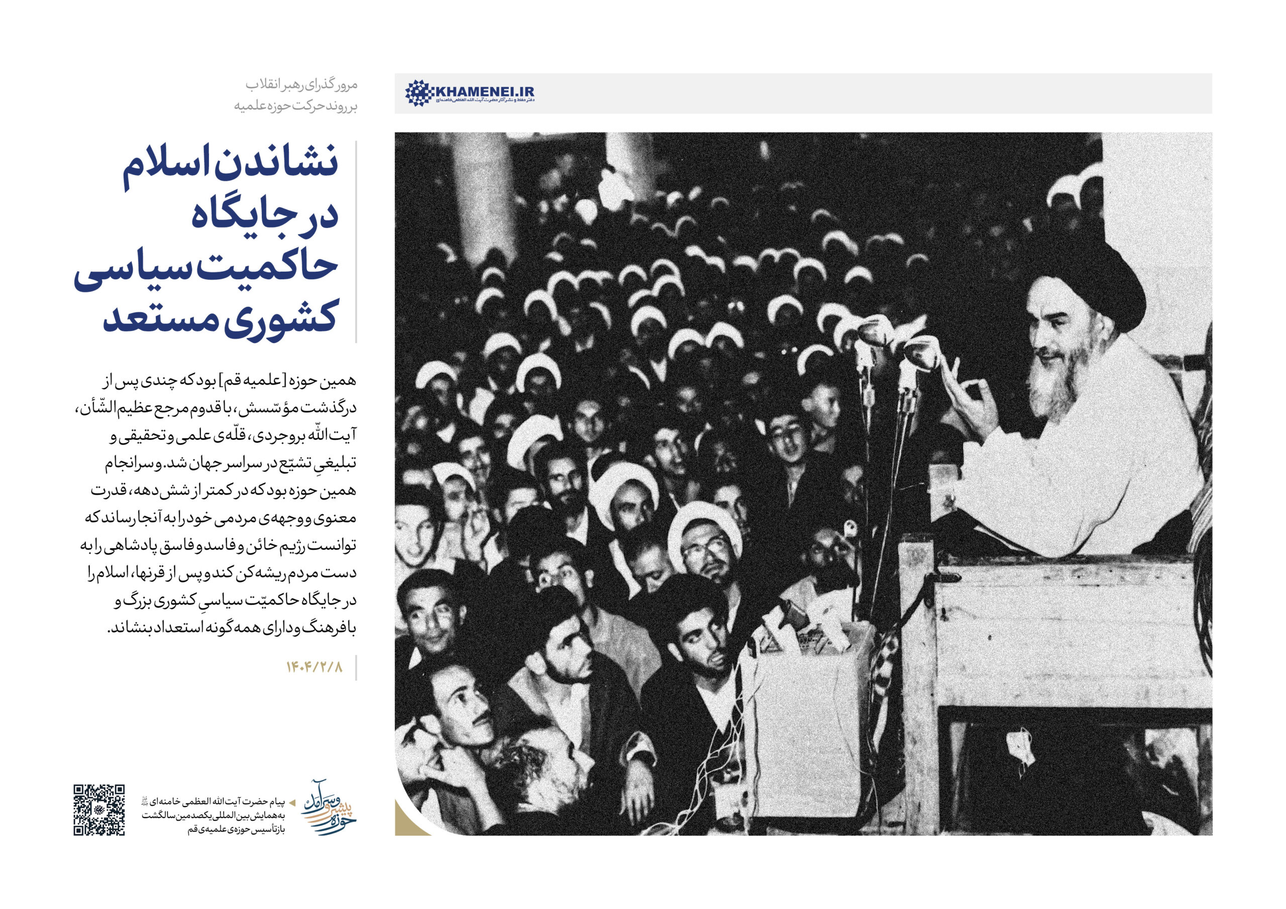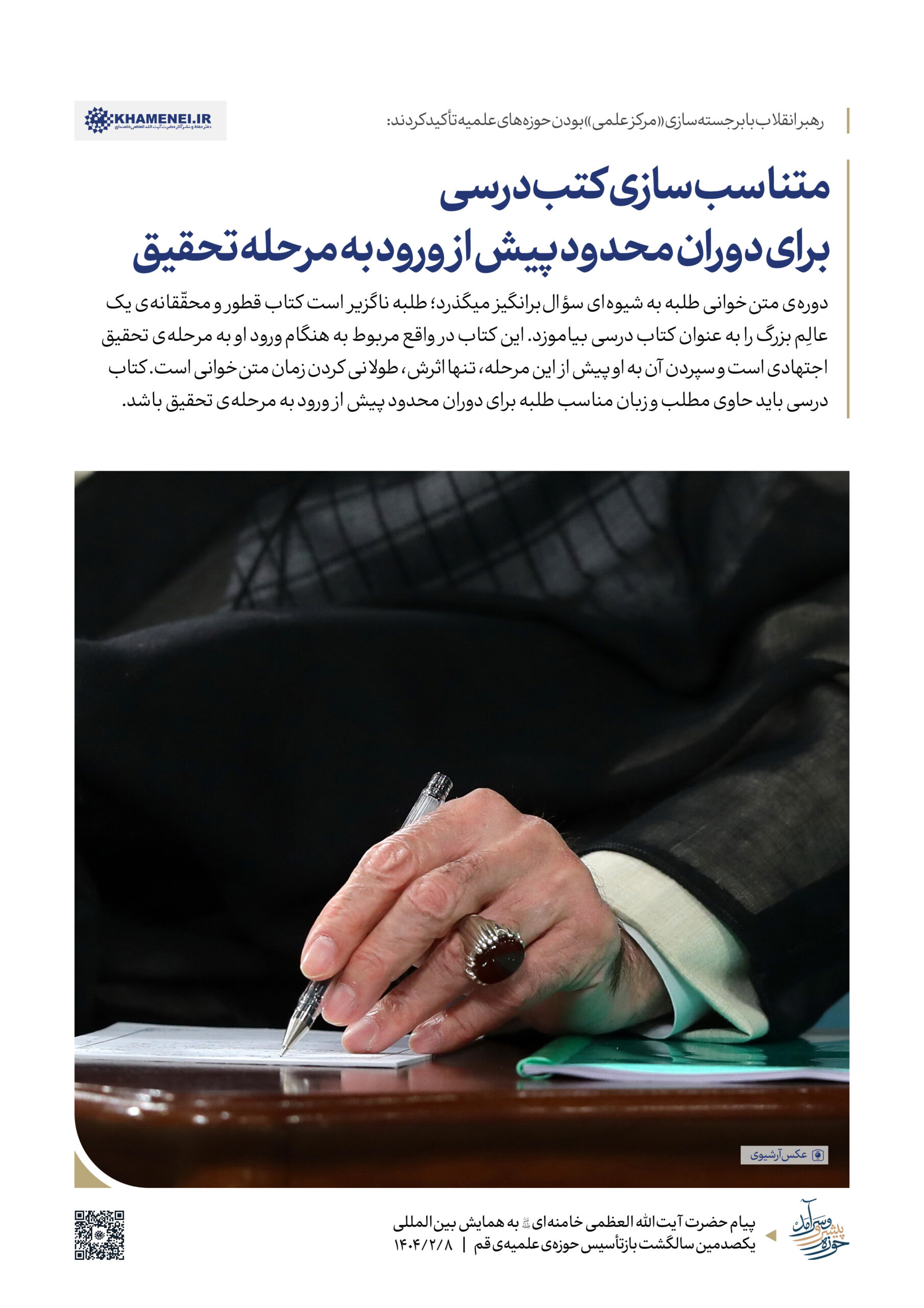 حضرت آیتالله خامنهای رهبر انقلاب اسلامی در پیامی به همایش «یکصدمین سالگشت بازتأسیس حوزه علمیه قم»، ضمن تبیین عناصر و کارکِردهای گوناگون حوزه به بیان الزامات تحقق یک «حوزه پیشرو و سرآمد» که نوآور، بالنده، بهروز، پاسخگوی مسائل نوپدید، مهذّب، دارای روحیه پیشرفت و مجاهدت و هویت انقلابی و همچنین مستعد برای طراحی نظامات اداره جامعه است، پرداختند. به همین مناسبت رسانه KHAMENEI.IR در این اطلاعنگاشت، مروری بر محورهای اصلی و توصیههای رهبر انقلاب در این پیام داشته است.