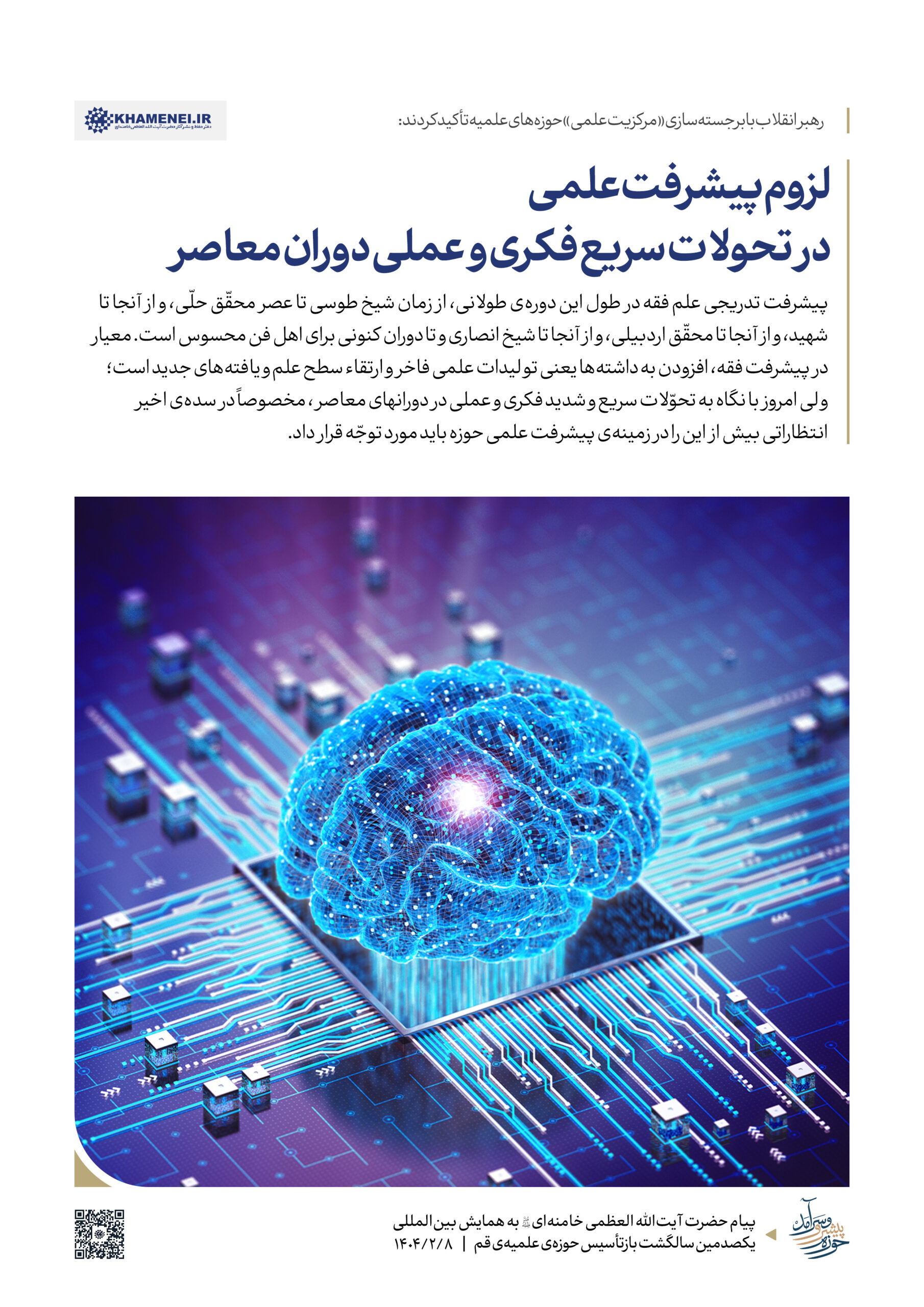 حضرت آیتالله خامنهای رهبر انقلاب اسلامی در پیامی به همایش بینالمللی یکصدمین سالگشت بازتأسیس حوزهی علمیهی قم»، ضمن تبیین عناصر و کارکِردهای گوناگون حوزه به بیان الزامات تحقق یک «حوزه پیشرو و سرآمد» که نوآور، بالنده، بهروز، پاسخگوی مسائل نوپدید، مهذّب، دارای روحیه پیشرفت و مجاهدت و هویت انقلابی و همچنین مستعد برای طراحی نظامات اداره جامعه است، پرداختند و تأکید کردند: مهمترین وظیفه حوزه «بلاغ مبین» است که از برترین مصادیق آن ترسیم خطوط اصلی و فرعی تمدّن نوین اسلامی و تبیین و ترویج و فرهنگسازی آن در جامعه است.